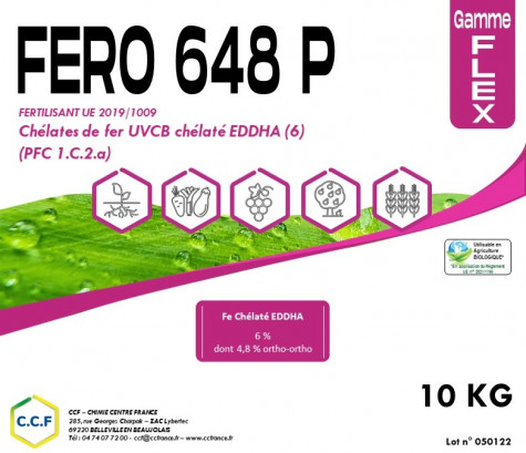Teneurs : - Fer chélaté par EDDHA : 6 % dont 4,8 sous forme ortho-ortho.
