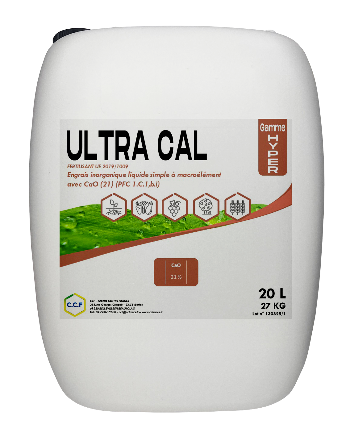 Solution d’engrais à forte teneur en calcium pour une utilisation au sol. ULTRA CAL est une solution à base calcium hydrosoluble permettant de réaliser des apports massifs de calcium.