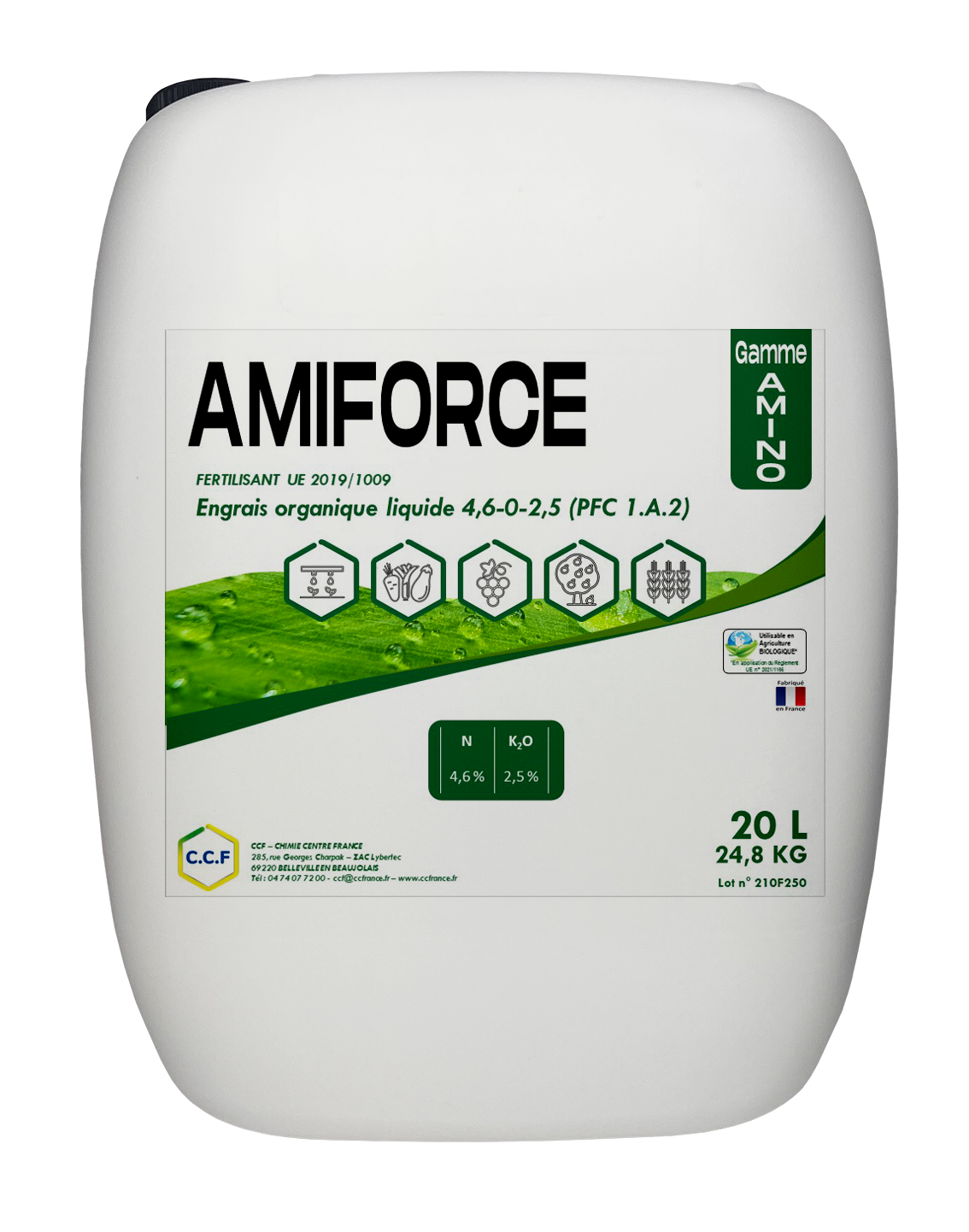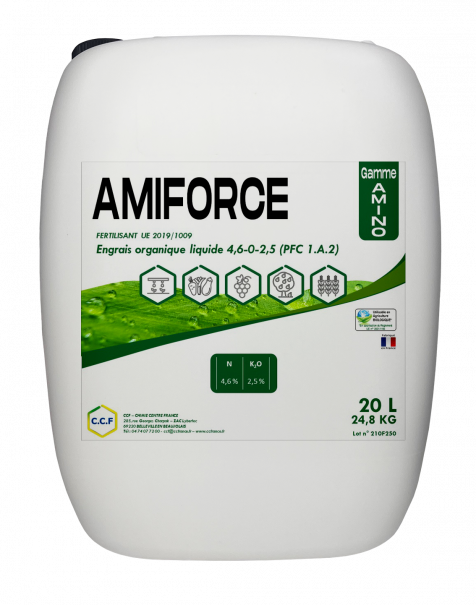 Engrais liquide spécifique pour un apport riche et varié en N, K2O et 30% d’acides aminés d'origine végétale disponibles très rapidement pour la plante. Formulé à base de vinasse concentrée. AMIFORCE joue un rôle prépondérant face aux différents stress climatiques pouvant intervenir tout au long du cycle. Utilisable en agriculture biologique, conformément au règlement UE 2021/1165. Compatible avec les herbicides, fongicides, insecticides, régulateurs de croissance, engrais foliaires et oligo-éléments.