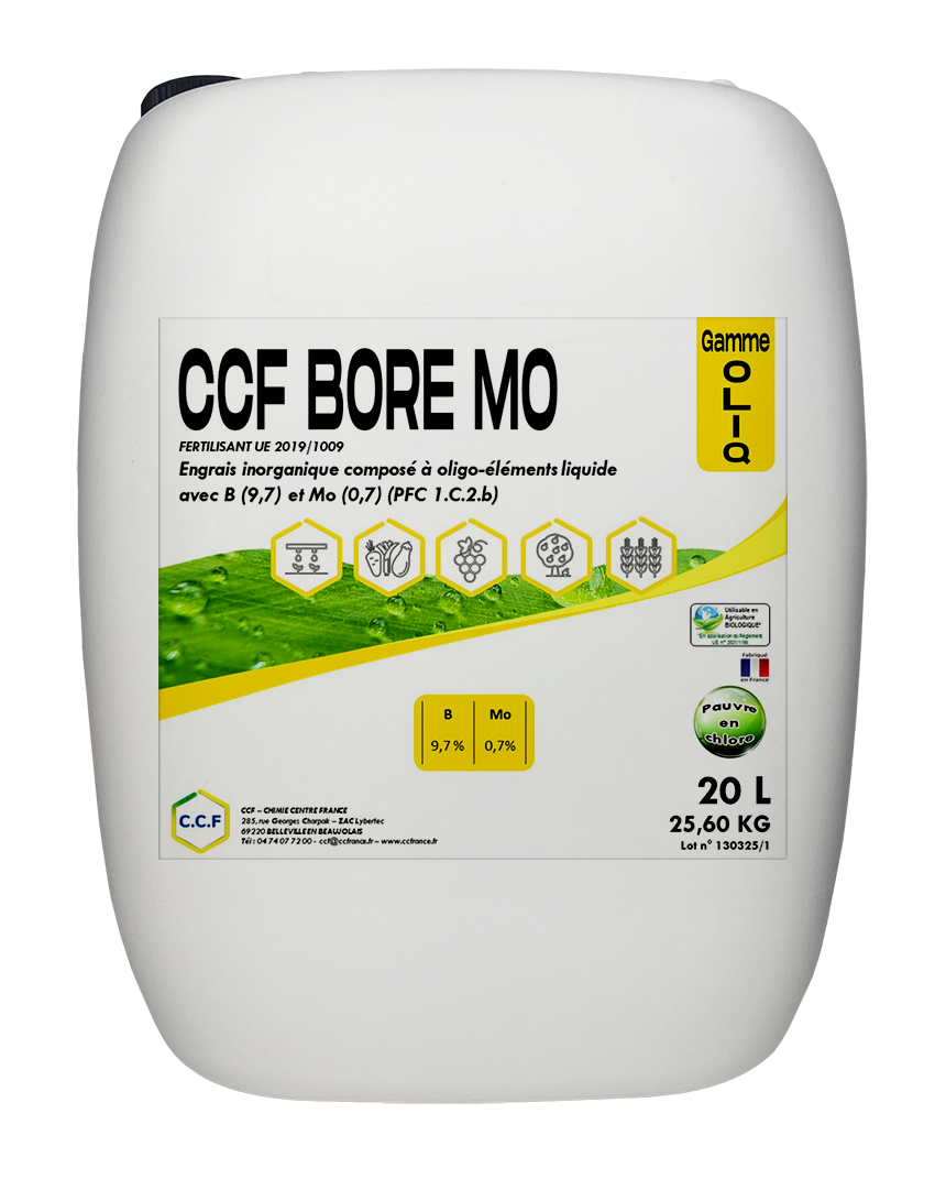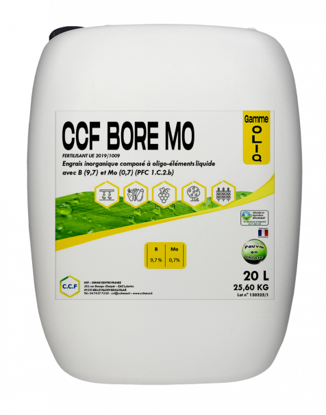 Engrais foliaire contenant du bore éthanolamine et du molybdène. À n'utiliser qu'en cas de besoin reconnu. Ne pas dépasser les doses adéquates. Utilisable en agriculture biologique, conformément au règlement UE 2021/1165.