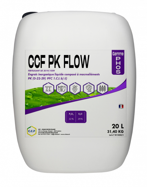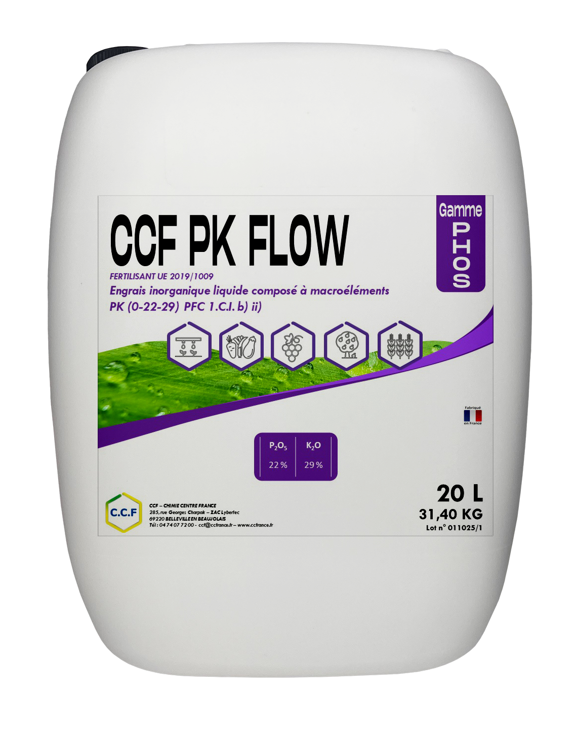 Engrais PK liquide concentré destiné à une utilisation foliaire. 1 litre contient 785 g de Pk sous forme TKPP.