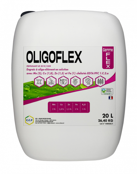 Contient 40 g/l de Mn, 23,8 g/l de Cu, 19,8 g/l de Zn, 13,2 g/l de Fe et 65 g/l de K2O.